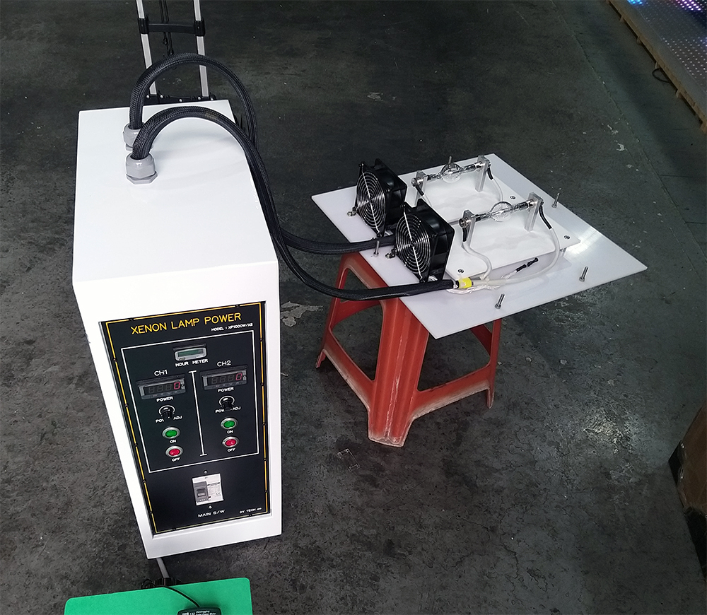 일산에 있는 건설용 석제품 제작하는 한 밴처업체에 1000W 제논램프(Xenon Lamp) 태양광 시험기(Solar Simulator)를 납품하였습니다. 이 업체에서는 스마트밴치,스마트블록(LED블록,태양광 발전블록) 등을 제작하고 있었습니다. 태양광 발전블록을 테스트하는데 사용될 예정입니다. 블록의 사이즈가 커서 1000W 제논램프 2개를 사용하였습니다. 제논램프는 램프 중앙에서 빛이 발생하므로 넓은 면적에 조사시 중심부와 외곽과의 차이가 발생하여 고른 빛을 위하여 여러개의 램프를 사용해야합니다. 업체 측에서 외부 챔버를 제작전이라 작동 테스트만 해 드렸습니다. 서포트잭과 광량계도 함께 납품하였습니다.