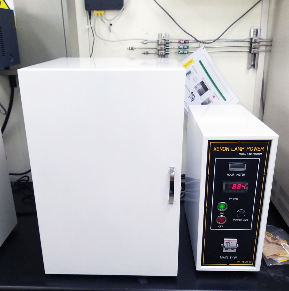 전남대학교에 1000W 제논램프(Xenon Lamp) 태양광 시험기(Solar Simulator)를 납품하였습니다. 광학필터(Optical Filter)가 포함된 구성으로 실험 조건에 맞춰 램프챔버(Lamp Chamber)의 높이를 높혀 제작하였습니다.