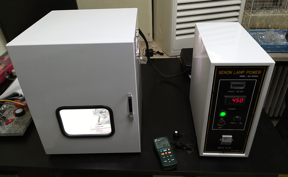 한국외국어대학교에 500W 제논램프(Xenon Lamp) 태양광 시험기(Solar Simulator)를 납품하였습니다. 260nm 부터 파장이 나오는 우시오(Ushio)사의 UXL-500D 램프를 사용하였습니다. 자외선 영역까지 파장이 나오는 램프의 경우 일반적인 제논램프(350nm~)에 비해 금액이 약 2배이상 높습니다. 램프 챔버(Lamp Chamber) 전면에서 변화를 볼 수 있도록 챔버 전면 일부를 유리로 제작하였습니다. 광량계와 서포트잭이 포함된 구성입니다.